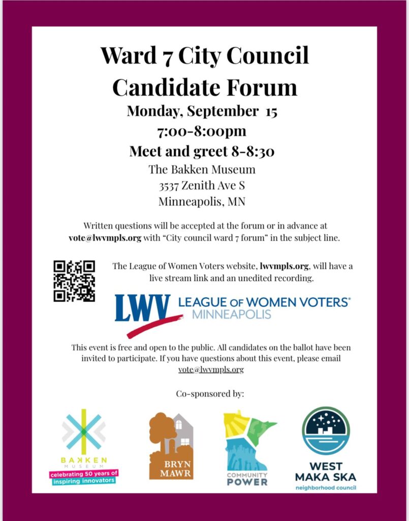 The Minneapolis League of Women Voters is hosting a Ward 7 City Council Candidates Forum on Monday, September 15, from 7 pm to 8:30 p.m., at the Bakken Museum.