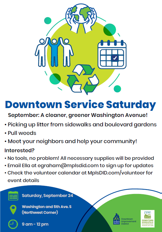 The next DMNA Service Saturday will take place on Saturday, September 24, from 9 a.m. to Noon. Meet at the NW corner of Washington and 5th Avenues.