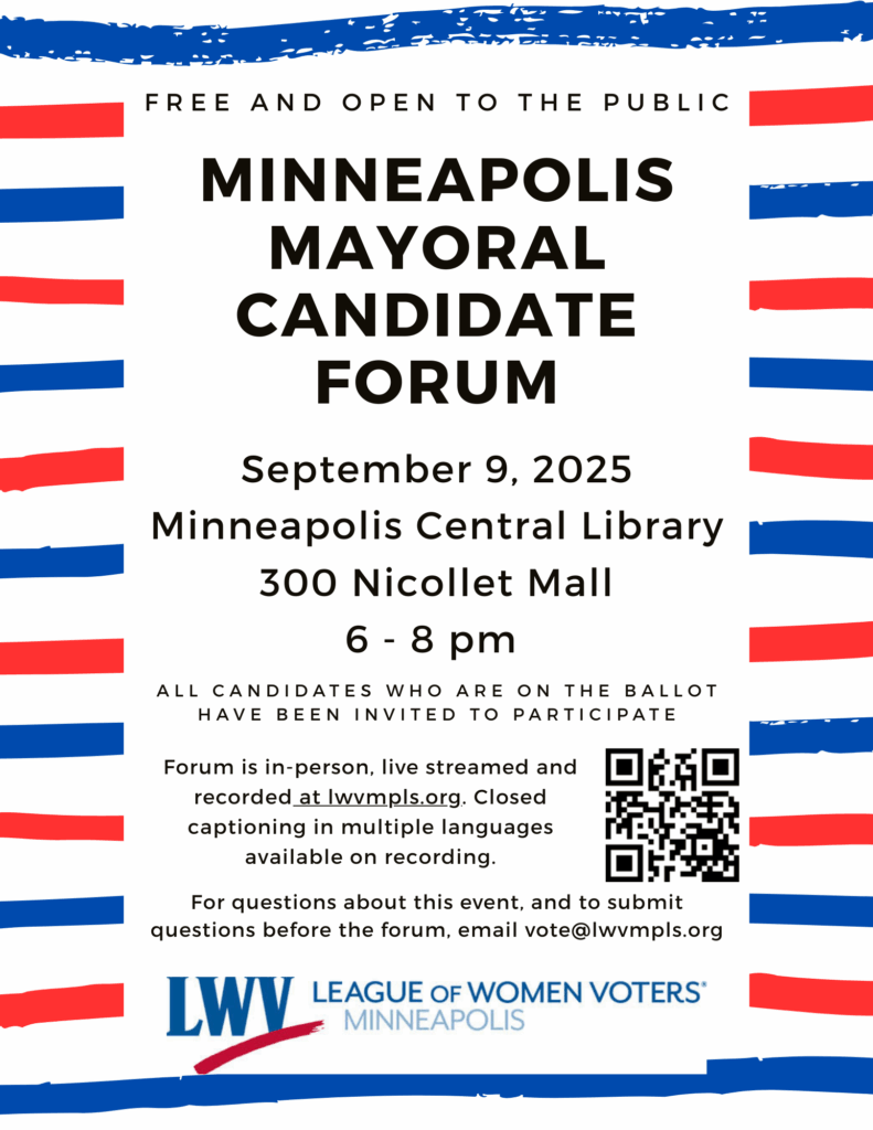 Minneapolis Mayoral Candidate Forum on Tuesday, September 9, at the Central Public Library