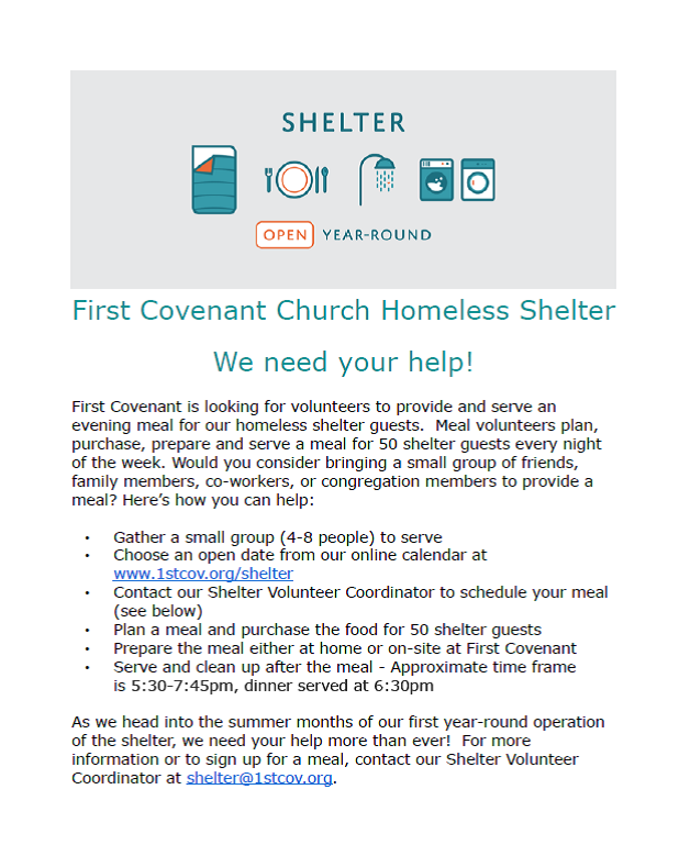 That said, the shift from 6-month to year-round operations requires greater community engagement to provide basic hospitality for our guests, particularly in regard to our evening meals. We are looking for individuals and groups (4-6 people) to help fill the gap as we enter our first summer of operation. Would you consider gathering a few friends, family, neighbors, or co-workers to purchase, prepare and serve a meal at the First Covenant Shelter? Here’s how you can help: