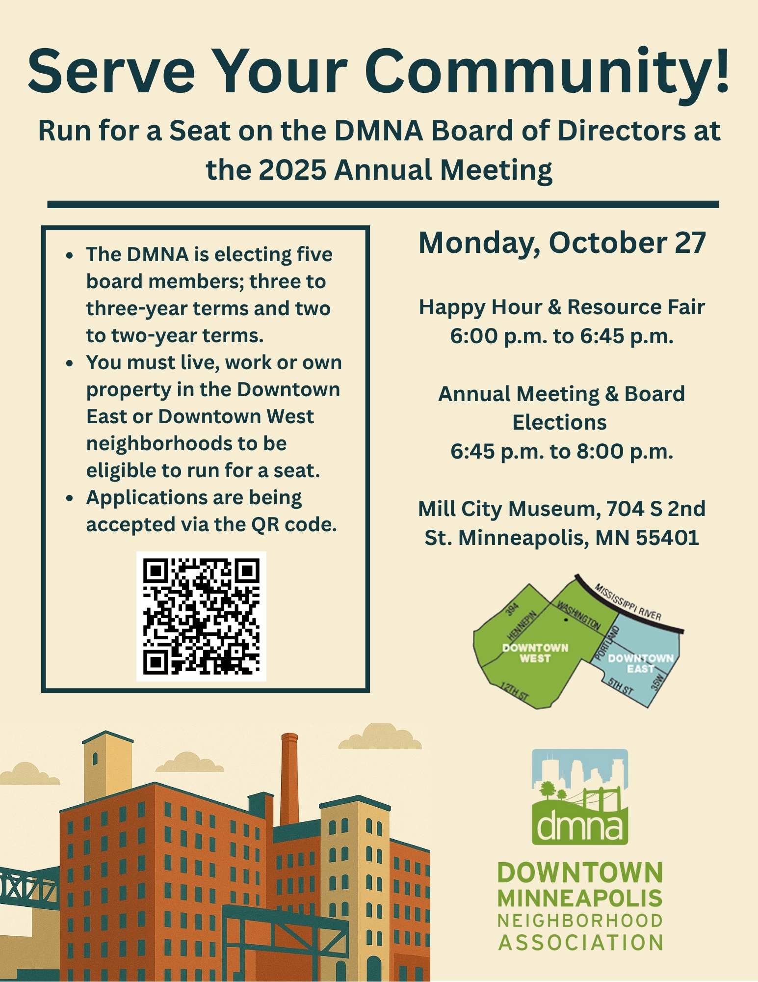 Board Elections will take place at the DMNA Annual Meeting on Monday, October 27, from 6–8 p.m., at the Mill City Museum.