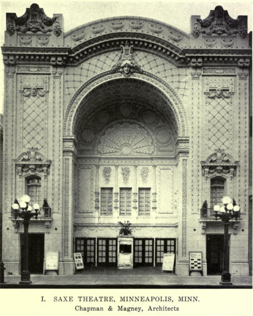Built in 1911, the Saxe Moving Picture Theatre was the first structure in Minneapolis built as a movie theatre. The Saxe, built at a cost of $150,000, was one of the most luxurious and ornate theatres in Minneapolis. The theatre seated 1,600 and was built in the Spanish Renaissance style.
