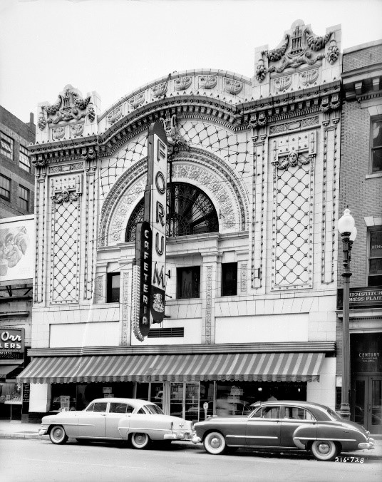 In 1929, the Forum Cafeteria Company purchased the building and enlisted its house architect, George B. Franklin, to convert the theatre into one of its cafeterias.