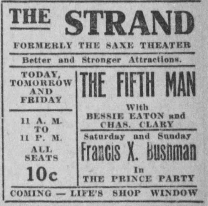 The Saxe name did not last. In 1914, the theatre’s name was changed to the Strand Moving Picture Theatre.