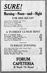 The marquee bore the name Strand until 1929, when the Forum Cafeteria Co. of Kansas City, Missouri signed a lease on the space, with the intent of converting the theater into a restaurant. It would be the company’s eighteenth location and a place where office workers, tourists, and shoppers stopped for inexpensive meals.