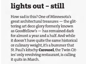 In 2010, The Forum Restaurant opened in the space with Jim and Stefanie Ringo at the helm. Unfortunately, the Restaurant closed after less than a year of operation. During the Ringo’s tenure, the Minneapolis Heritage Preservation Commission issued the couple an award for restoring and safeguarding the building’s interior.