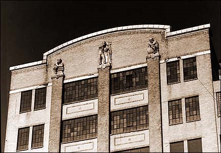 The figures were carved by John Karl Daniels and scaled to half-size, three to four feet tall, and then doubled in size and reproduced in glazed terra-cotta. Mr. Daniels was paid $200-$300 for his one and a half month’s work. Sculpting was done by watching workers at the mill; no models were used. Two large-sized windows placed in the center of the horizontal band of windows are balanced by two smaller windows on each end.