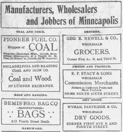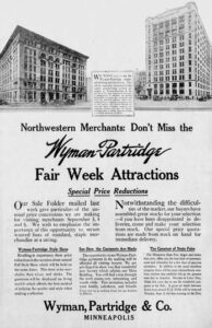 H.E. Partridge, President and general manager of Wyman Partridge & Company, left the business in early 1901 due to health concerns. That same year, the Minneapolis Tribune reported that not a single woman was employed in the seven-story Wyman Partridge Building. The new warehouse manager, Mr. Scott, reported that there was little opportunity for them, “the stenographer’s desk being the only place that they might be expected to fill”.