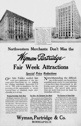 Wyman, Partridge & Company started business in 1874. Known as the largest dry goods jobber north of Chicago, Wyman Partridge operated as a wholesaler to retailers. The announcement of their new building signaled that First Avenue North would finally be considered the geographic center of the Minneapolis jobbing center. The company’s manufacturing facility for garments was located on North Fifth Street, while the new building at 400 First Avenue North would be used as administrative headquarters, warehouse space, and a retail store.