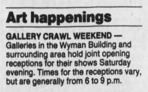 By the early 2000s, the warehouse gallery scene at the Wyman Building was dwindling. The April 2004 gallery showings of Thomas Barry, the Flanders Contemporary Art exhibit, and the Kellie Rae Theiss gallery exhibit were some of the final public exhibits in the Wyman Building, where rent had surpassed the budgets of artists and gallery owners.