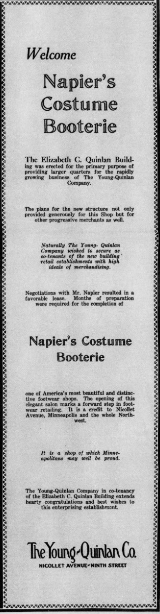 Napiers Costume Booterie was another primary tenant occupying space on the Nicollet Avenue side of the building. Young Quinlan would occupy 105,000 square feet. The building’s total square footage was 175,000. Additional tenant space was on the ground floor.