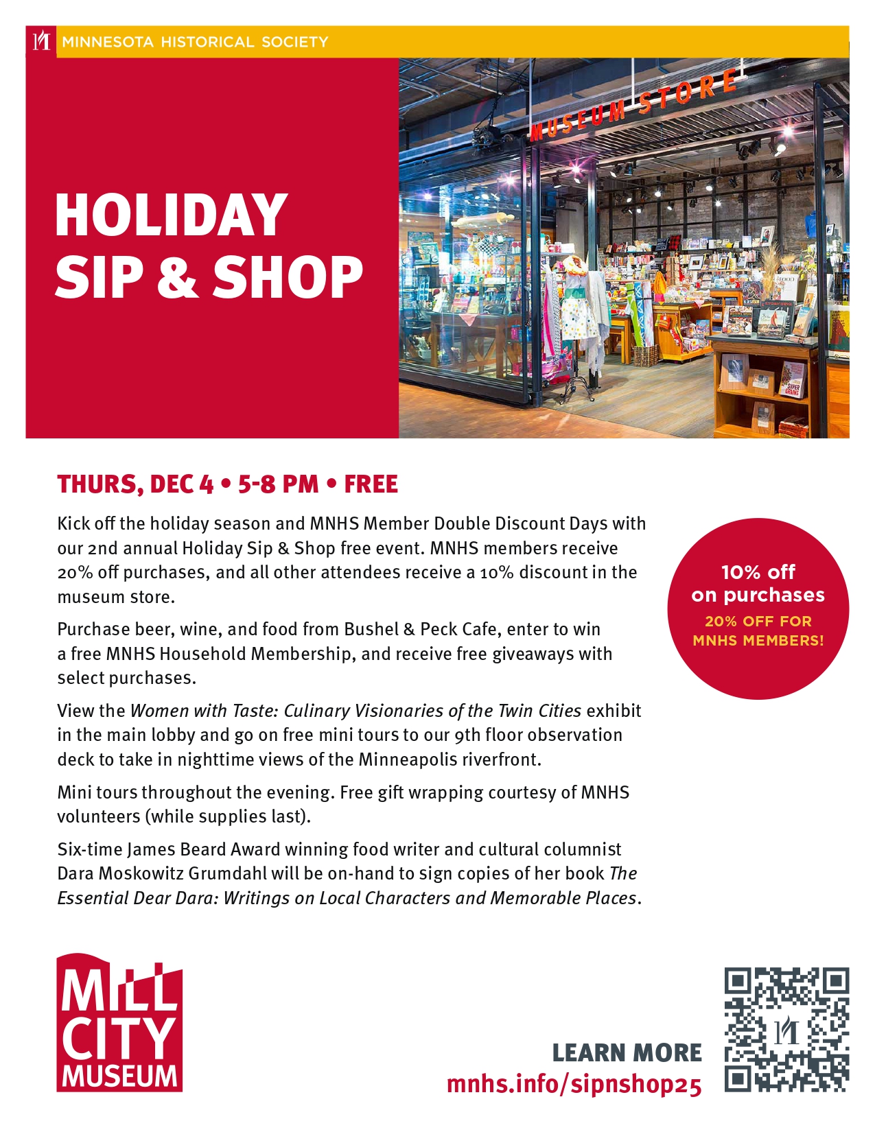 Kick off the holiday season and MNHS Member Double Discount Days with the Mill City Museum‘s 2nd annual Holiday Sip & Shop free event. MNHS members receive 20% off purchases, and all other attendees receive a 10% discount in the museum store.