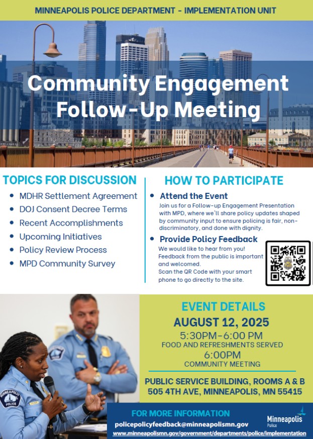 The Minneapolis Police Department’s Implementation Unit would like to invite you to a Community Engagement Follow-Up Meeting on Monday, August 12, 2025, from 5:30 PM to 7:00 PM at the Public Service Building (Rooms A & B), 505 4th Ave S, Minneapolis.