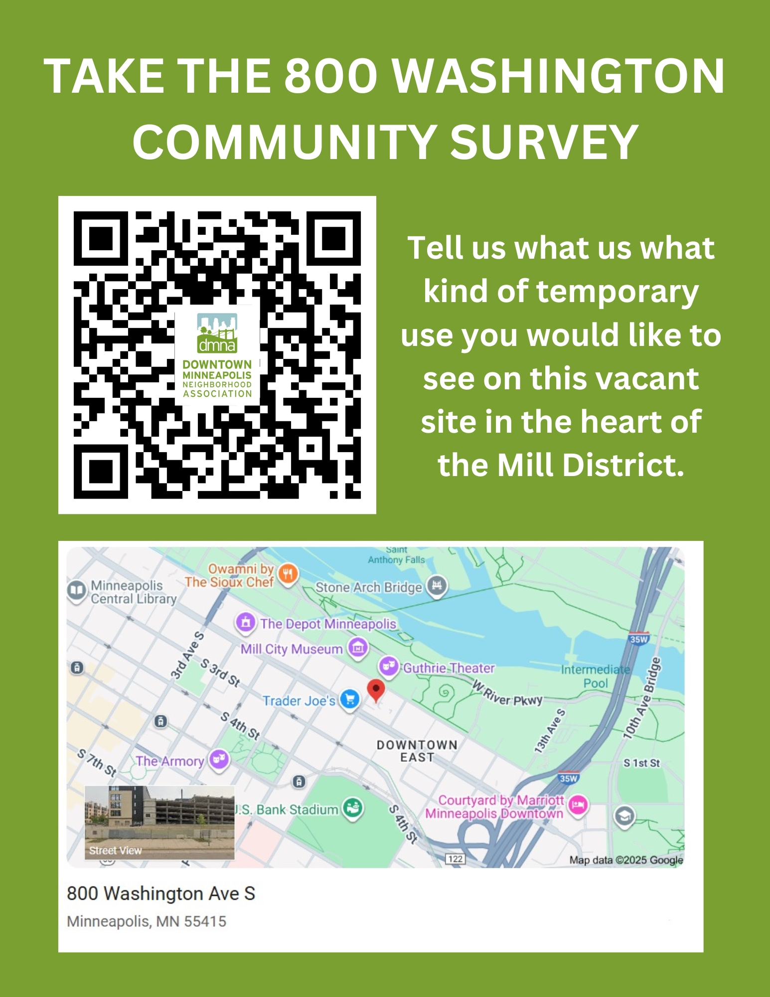 The Downtown Minneapolis Neighborhood Association (DMNA), in partnership with the City of Minneapolis Community Planning and Economic Development Department, is exploring ideas for an interim or temporary use for the currently vacant lot at 800 Washington Avenue until such time that the city receives an optimal development proposal. We want to hear from residents, workers, and visitors about what would benefit and activate this important space in the heart of our neighborhood.