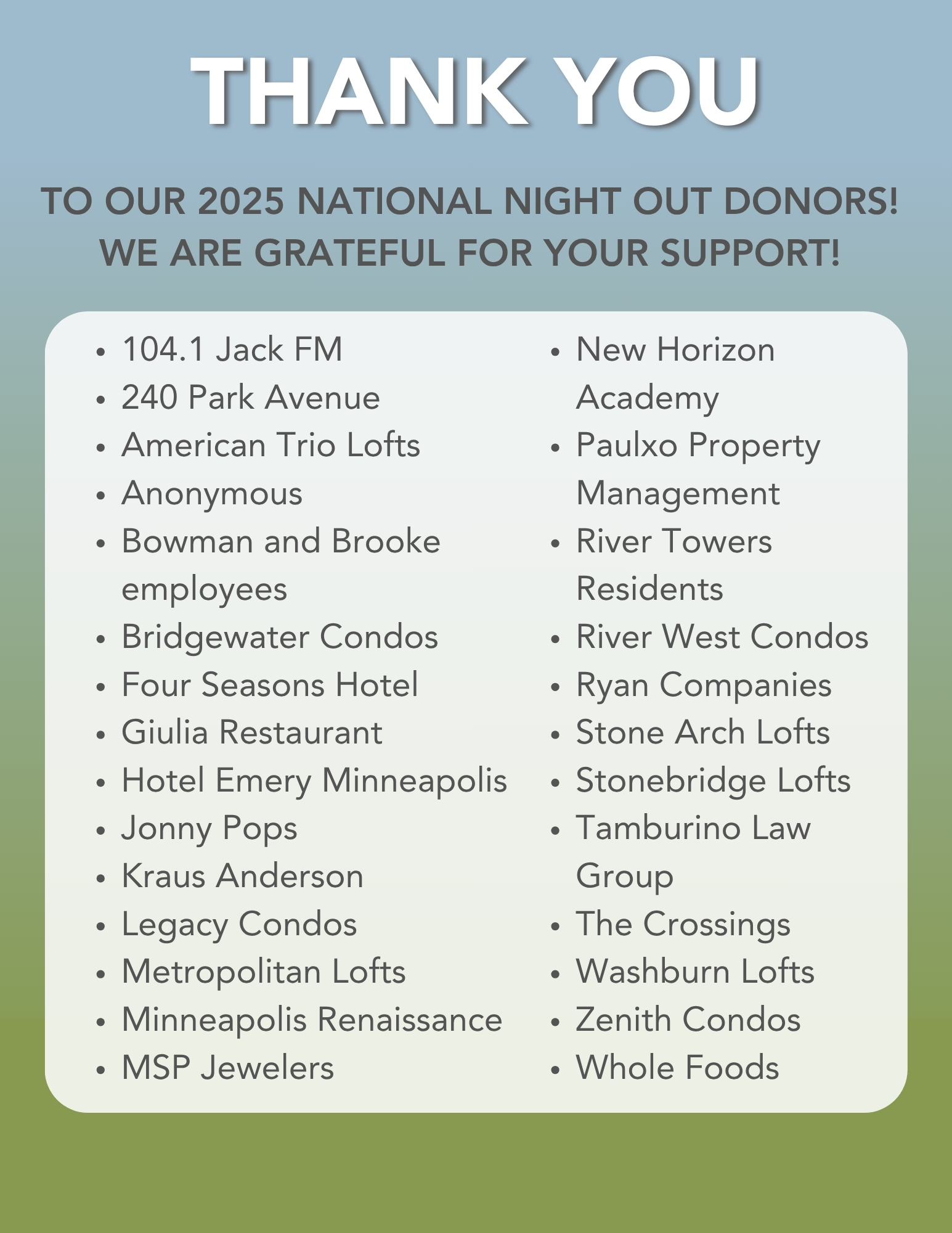 We would like to extend our deepest gratitude to the organizations, businesses, and residents that made financial contributions to the DMNA National Night Out celebration. Your generosity played a crucial role in making this event a tremendous success.