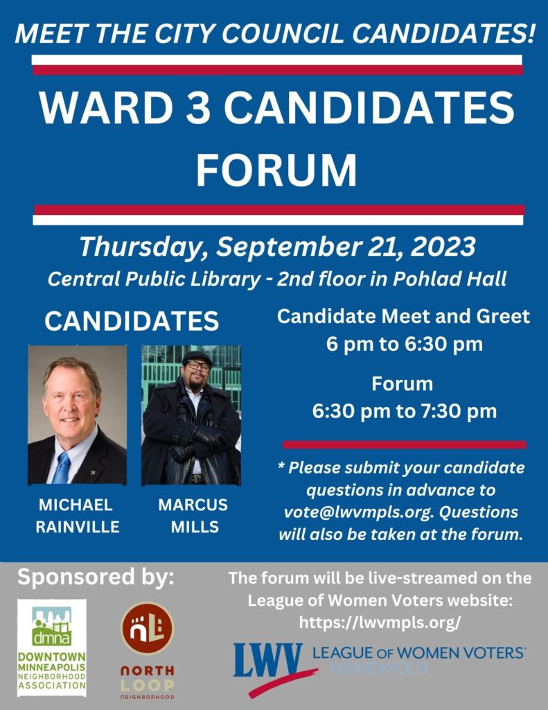If you were unable to attend the Ward 3 City Council Candidates Forum on September 21 at the Central Public Library, the MCN6 livestream recording is available for viewing on the League of Women Voters of Minneapolis YouTube Channel.